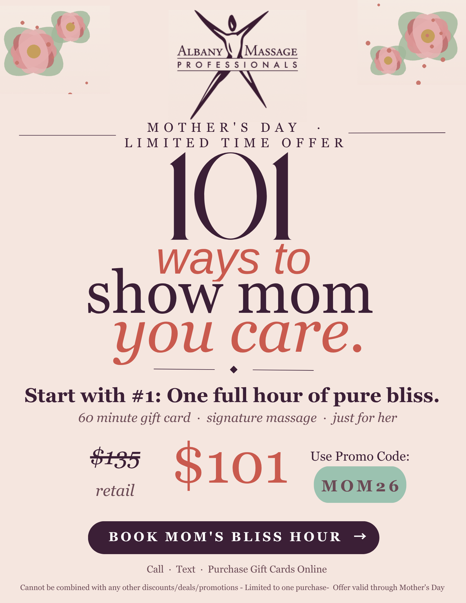 This Mother’s Day, we’re making it easier than ever to show her she’s worth it. For a limited time, treat the mom in your life to a therapeutic massage experience for just $101 — a savings of $34 off the regular rate of $135. This exclusive offer won’t last long, so don’t wait to book her something truly meaningful.